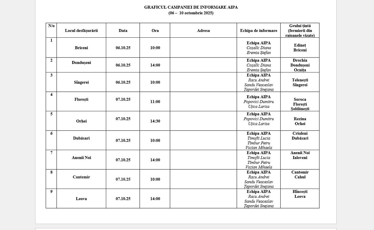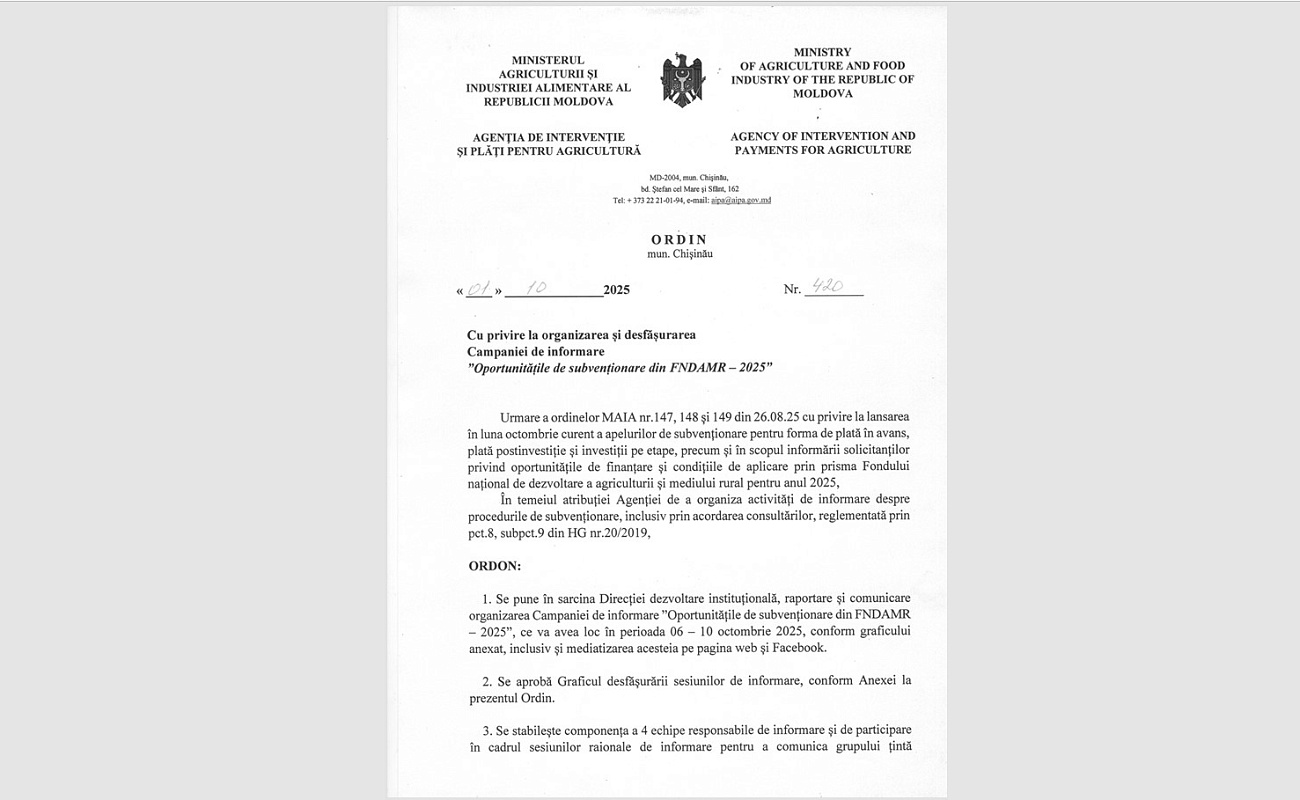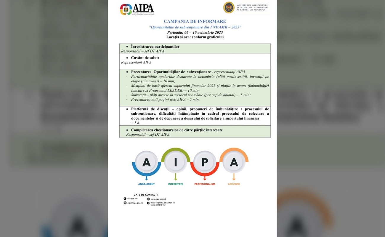 Министерство сельского хозяйства и пищевой промышленности Республики Молдова, Агентство по интервенциям и платежам в сельском хозяйстве информирует об организации и проведении